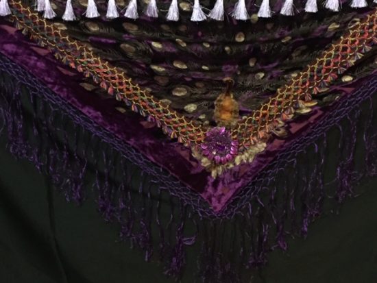PEACOCK BURNOUT VELVET SCARFS WITH 8″-10″ CROCHETED FRINGE IT IS 60″ WIDE AND 30″ LONG FROM TOP TO BOTTOM AND EACH SIDE IS 38″ LONG.