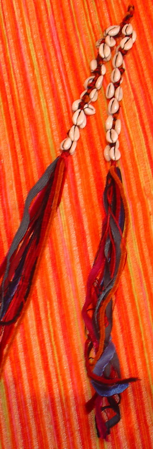 MADE FROM AMULETS,COINS,LACES,BUTTON AND BEADED TRIMS.
