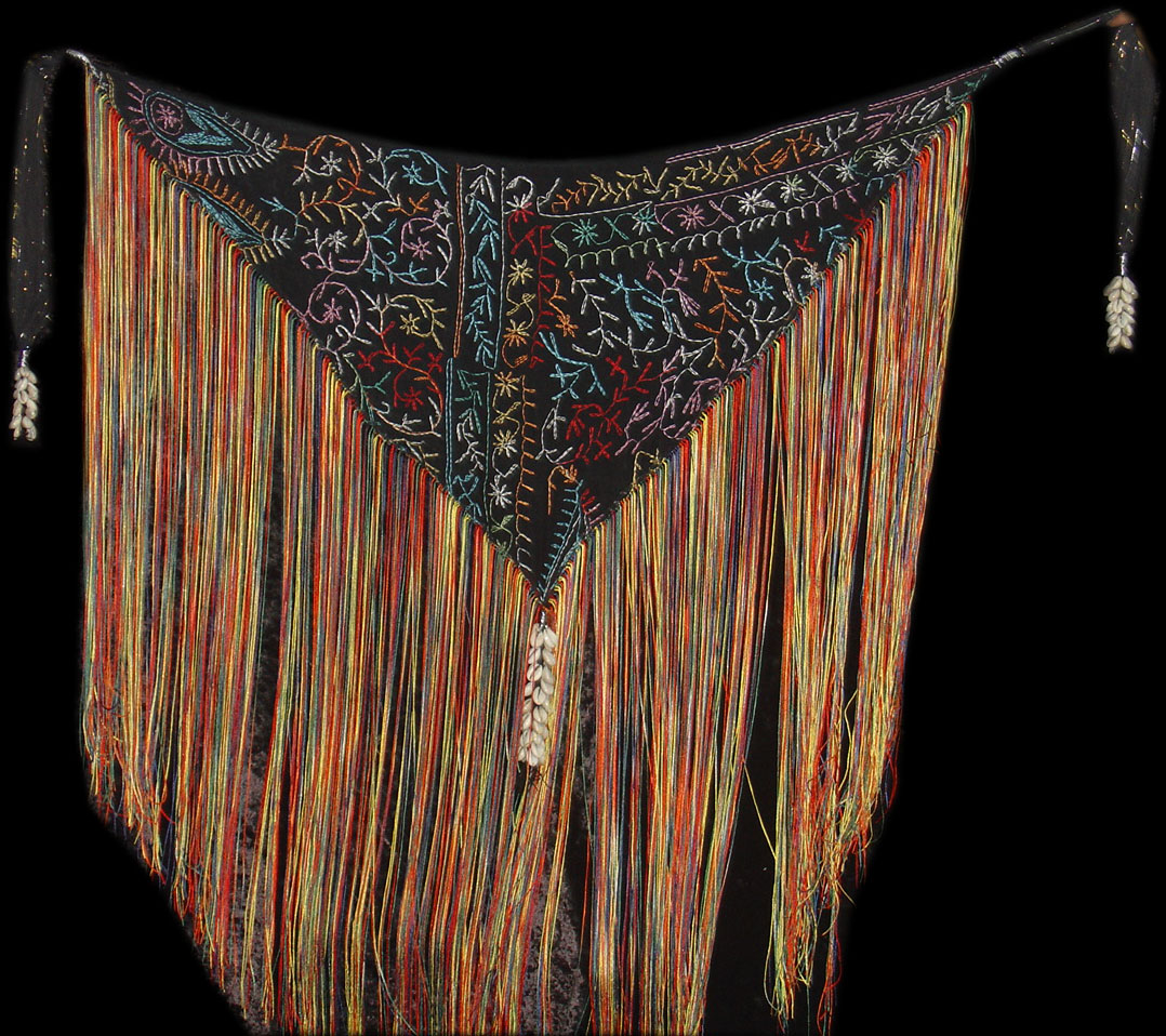 MULTANI HAND EMBROIDERED BELT WITH 30″ LONG BLACK RAYON FRINGE & THREE SHELL TASSELS ATTACHED WITH IT