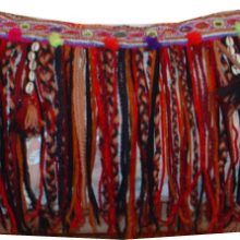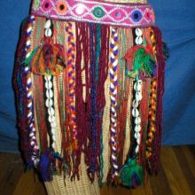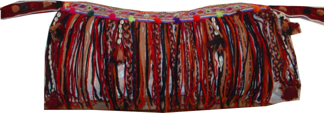 Our Mix fringe tribal belt(30″long )(12″ties on both sides with pom pom tassels on them)with 15″long mix fringe of 100%pure wool and velvet wool fringe, the belt also has got 4 shell strands and 8 wool tassels attached on it.