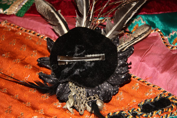 SPECIAL FLORAL HEAD CLIP WITH PEACOCK AND OTHER MIX FEATHERS & BROOCH
