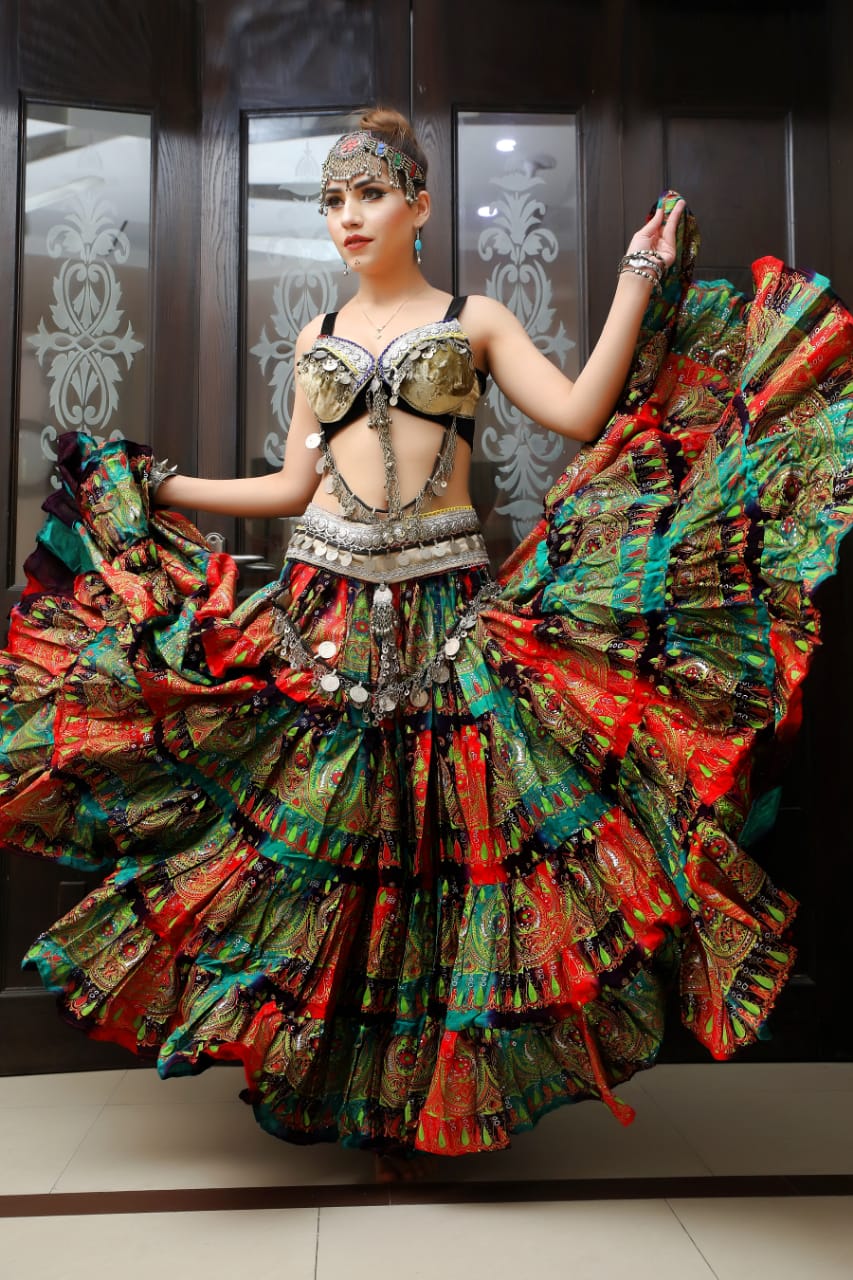 Tribal Bellydance Multi Beauty Tie Dye Skirt Four Border Green Red